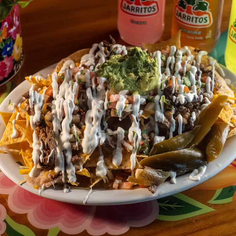 Asada, melted cheese, beans, pico de Gallo, jalapeños, sour cream & guacamole.