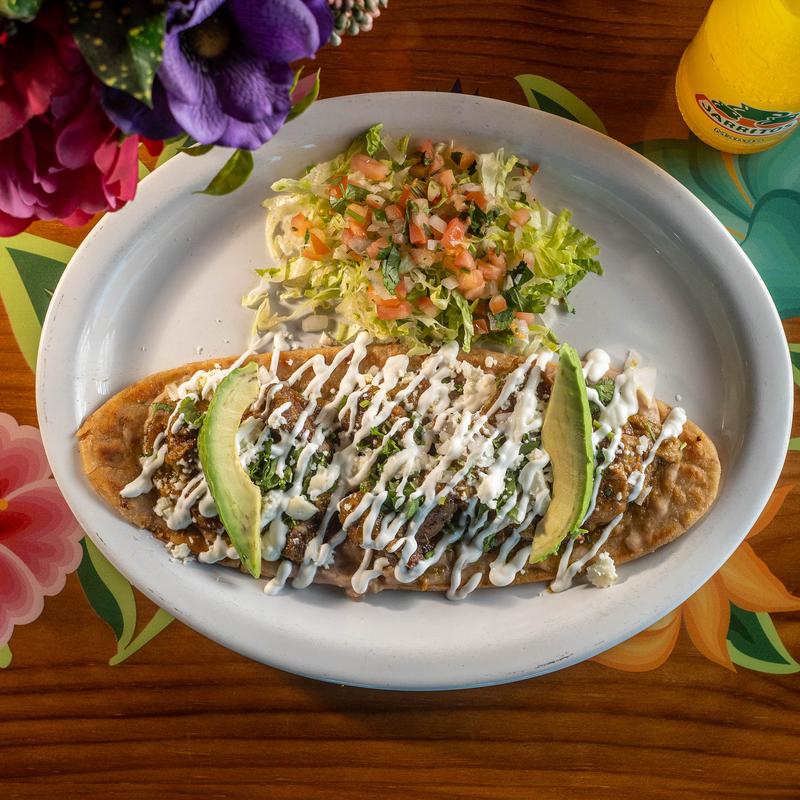 Reg $12.99 | TLC $16.00 • Choice of protein, spread of beans, onion, cilantro, avocado slices, sour cream, and queso fresco.