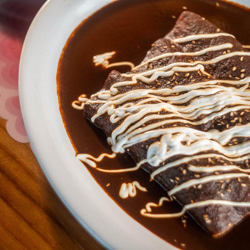Shredded chicken, Spanish rice & refried pinto beans. Topped with mole oaxaqueño, sesame seeds, and sour cream.