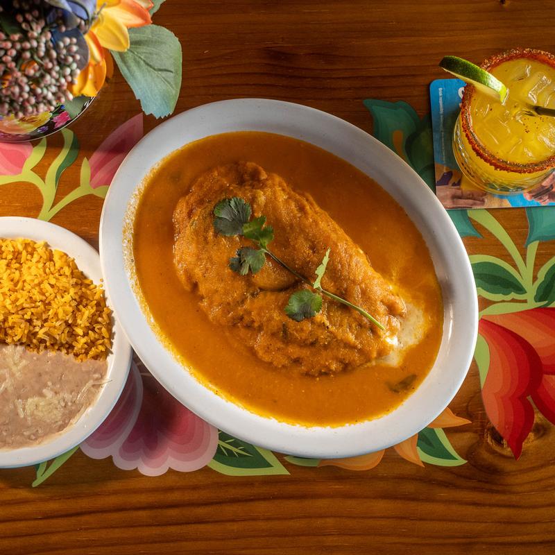 Beef simmered in our own chiles and spices for hours, we add Spanish rice and refried pinto beans inside with onion and cilantro. Then smothered with more chile colorado, sour cream & cheese.