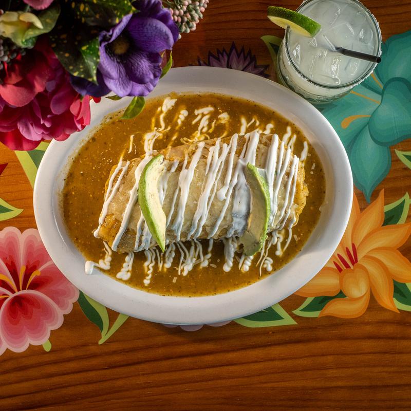 Choice of protein, Spanish rice, refried pinto beans, then topped with salsa verde, sour cream & melted cheese.