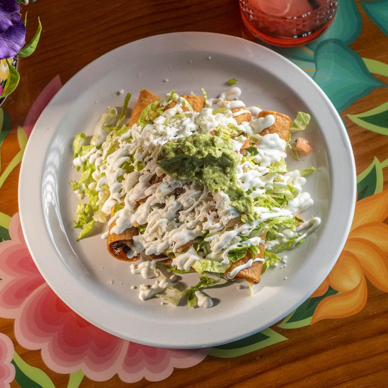Corn tortilla with deep-fried, golden-brown chicken, topped with fresh lettuce, pico de gallo, queso fresco, and sour cream.